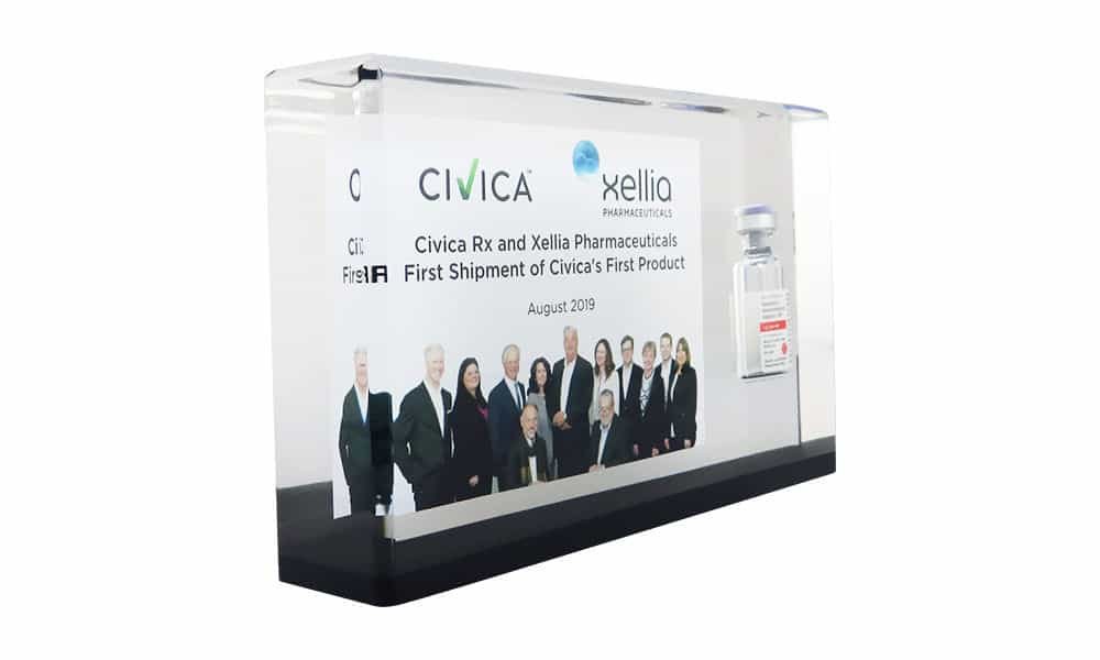 A great example is the piece shown above, which celebrates FDA approval of Cosela with a commemorative incorporating an actual vial of the drug.