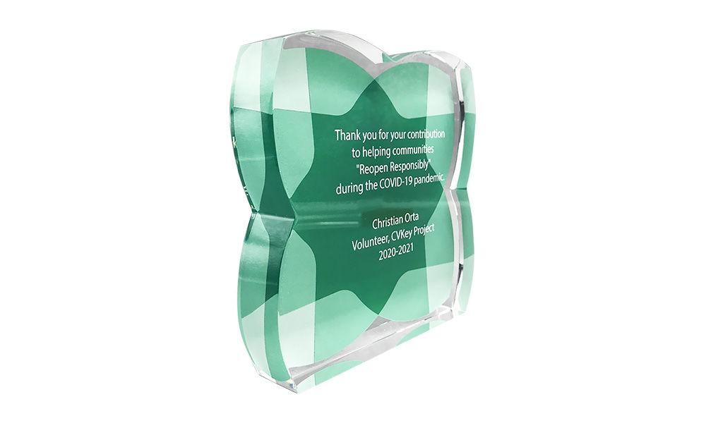 For instance, CVKey Project and Jenesse Center volunteer recognition pieces take their shape from the organization’s logo. The Plaza College donor recognition piece, on the other hand, plays off the school’s colors.
