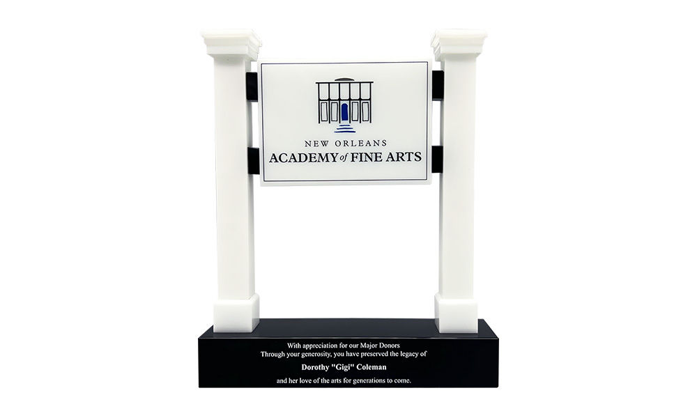 A great example of this appears in the gallery below. The donor recognition piece was designed for the New Orleans Academy of Fine Arts, the design drew its inspiration from the Academy’s distinctive signpost.